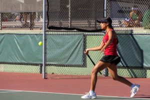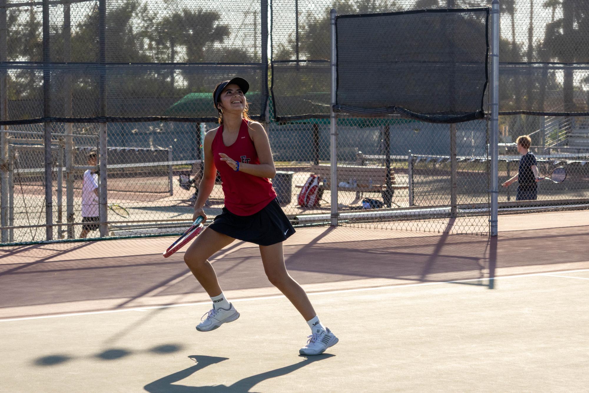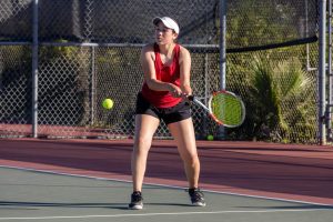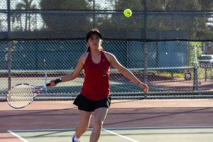With the sun at her back, Lilian Gonzalez ’28 dashes up the doubles alley to a tennis ball fast approaching. This is her second season playing doubles on Foothill Tech’s girls varsity tennis team, and she looks forward to the possibility of two more rewarding years.