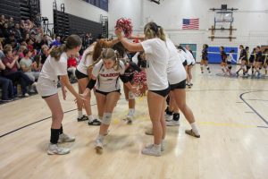 The Foothill Tech girls Junior Varsity (JV) girls volleyball team cheers on Rylie Hannah ‘26 as she runs through the tunnel. This pregame cheer is a way to get the crowd and players excited for the game.