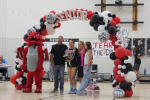 Senior Samantha Jacobson ‘26 poses with her mom and Foothill Tech’s mascot, Fuego the Dragon. The crowd applauded her hard work and dedication she had shown throughout her years playing in girls’ volleyball.