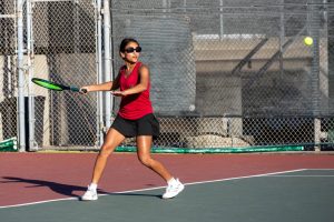 The sun was beaming and the winds were soaring on Thursday, Oct. 9, when Foothill Tech’s girls varsity tennis team took to Ventura College’s courts with two goals: to slam down their opponents from St. Bonaventure High School and to celebrate their senior players. Team captain Saanvi Joshi ‘26, Violet Polley ‘26, Aarna Khanavkar ‘26 and Diana Hixon ‘26 were honored through creative posters handmade by fellow teammates, while friends and family gathered to witness one of the last matches of their high school tennis careers. Joshi, pictured above, drives home a winning point.
