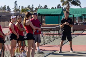 Before the matches begin, girls tennis coach Jason Dinkler gives a brief address of appreciation to each of the senior players. As the interim coach for the season, Dinkler has helped manage the team’s practices and games, providing a steady backbone for the players.