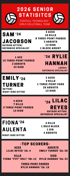 On the evening of Tuesday, Oct. 7, the Foothill Technology High School girls varsity volleyball team faced Santa Clara High School in their last regular-season home game in the Cabrillo Middle School gym. This night was a special one, as it was Foothill Tech’s senior night, giving the seniors their time to shine. The Dragons took the victory in three exciting sets against Santa Clara.
